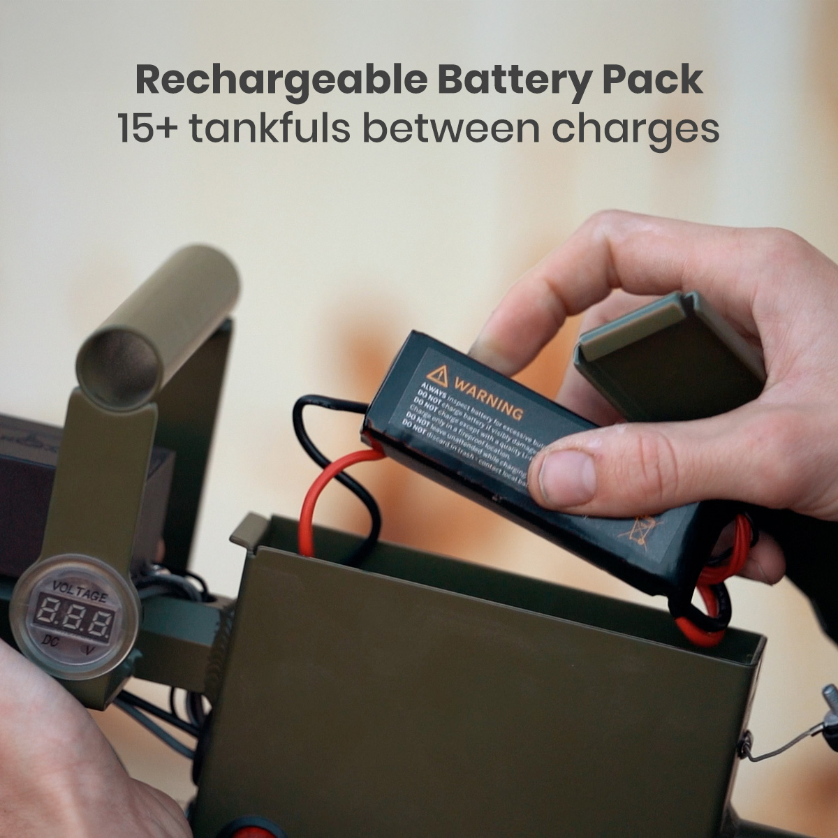 Fully charged, it should power the system for about 15 full tanks of fuel, and 2 full tanks using the backpack. Environmental conditions as well as variations in manufacturing (of the battery, nozzle, pump, fuel reservoir etc.) can affect this capacity.